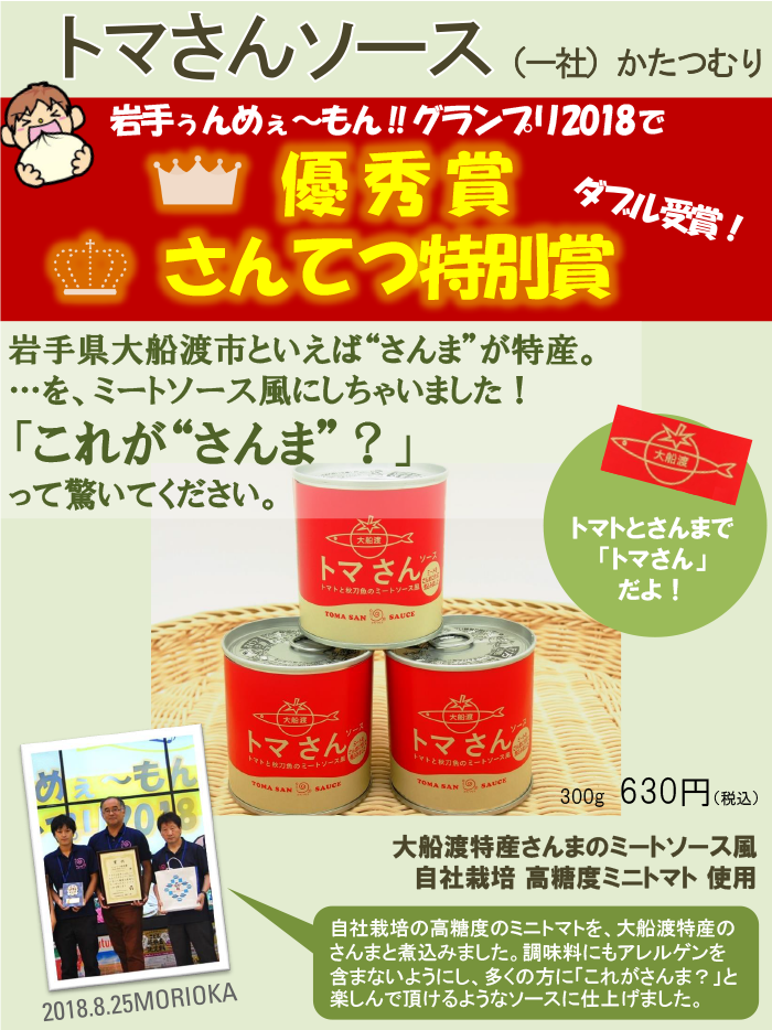自社栽培の高糖度のミニトマトを、大船渡特産のさんまと煮込みました。調味料にもアレルゲンを含まないようにし、多くの方に「これがさんま?」と楽しんで頂けるようなソースに仕上げました。