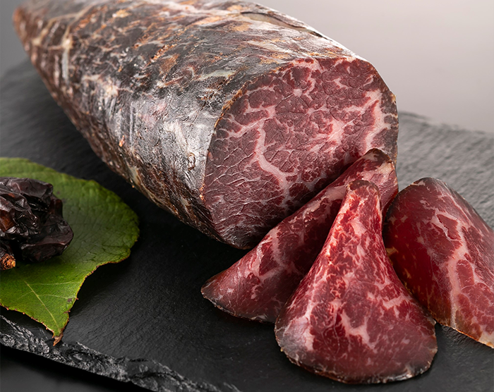 和牛で唯一「旬」がある「いわて短角和牛」。和牛の中でも1%に満たない日本固有の希少種です。この「旬」という美味なる時間を止めていつでも楽しめる食材にすることはできないかと考えました。そこで出会ったのが「セシーナ」というスペイン北部レオン地方を発祥とする牛肉の生ハムです。「セシーナ」は塩漬けした牛肉を1年以上乾燥熟成して作ります。まさに「旬」という時をとじこめながら熟成という技でおいしさを更に高められる理想の技術でした。試行錯誤の上、ついにふるさとの海塩「のだ塩」を使い、本場に勝るとも劣らない味わいを完成させました。「旬」を大切にする日本の食文化から生まれた日本初の和牛熟成生ハム「セシーナ」。この「セシーナ」が認められることは、希少種「いわて短角和牛」の生産者の収入を増やし、後継者を育て、美しい自然放牧風景を未来に残していくことにつながります。「旬」の美味しさとともに、弊社の想い、生産者の想いも詰まった「セシーナ」をどうぞ心ゆくまで味わってください。