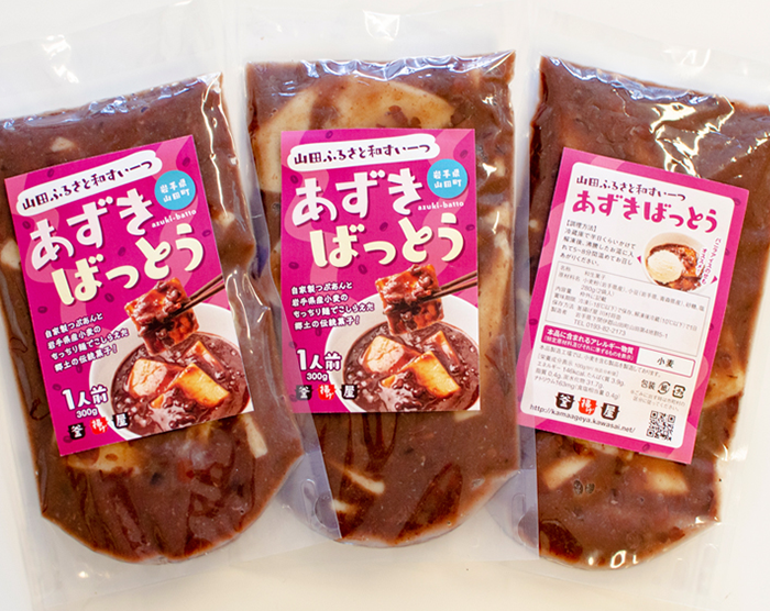 あずきばっとうとは、あんこに短めの平打ちうどんが入った岩手県沿岸中部の郷土料理です。山田で8月7日は『なのかび』と言って、7回海で泳ぎ7回あずきばっとうを食べるとその年は無病息災で過ごせると言う風習があります。この食文化をおいしく後世に伝えるべく、うどんや麺の技術を持った弊社が食べやすく、おいしく流通させるため冷凍あずきばっとうとして開発しました。麺は従来の平打ち麺の形を4~5センチ角の板麺にし、小麦も岩手県産にこだわり『ねばりごし、もち姫』をベースにもちもち食感の麺に仕上げました。あずき豆は岩手県産と青森県産を使用し、じっくり職人が炊き上げ、お塩を少し効かせ甘すぎないあんこに仕上げました。又、栄養豊富な煮汁を使用することにより体にもおいしくなりました。従来は時期商品でしたが、通年で食べれて、なおかつ新しい食べ方を弊社がご提案します。