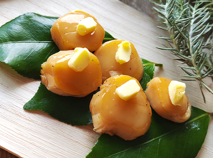 赤皿貝は養殖カキの殻などに付着し、その成長を阻害する邪魔モノでしたが、地元の漁師さんの中には、ホタテより味が濃くておいしいという人もいて、赤皿貝は「知る人ぞ知る」味でしたが、山田町の新たな特産物になりつつあります。当社では濃厚な燻製赤皿貝の味に合うように燻製したグラスフェッドバターを添えました。W燻製の濃厚なハーモニーをぜひお楽しみいただければと存じます。