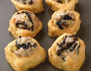 地元食材で作る新感覚しゅうまい。当社人気の油あげを舟と見立てて、岩手の豚肉、雫石町のしいたけ、きくらげなどを使用し優しく包み蒸しあげました。小麦粉不使用のため、グルテンフリーかつ小麦粉アレルギーの方でも安心して食べられます。蒸しあげの工程を入れることで余分な油をカットしてヘルシーです。