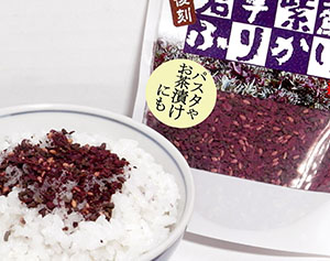 岩手県川井地区特産の川井赤しそを梅漬け用の量販向けならびに業務用の塩蔵川井赤しそを作る際に、選別でかたい茎の部分を取り除き、お金をかけて捨てていましたが、丹精こめた紫蘇を無駄にしたくないと思い、川井赤しその茎を乾燥させて粉末にしてふりかけの原料として使用した、もったいない&環境に考慮した新商品です。