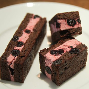 岩手県盛岡市川目砂子沢地区はアロニアの栽培が盛んな地域です。少しでも地域貢献をと、そのアロニアを自家製のコンフィチュールに食べやすく加工し、生地にもバタークリームにもふんだんに使用しました。ほどよく渋みを残し後ひく美味しさに仕上げました。冷やして頂くとよりおいしく食べることが出来ます。