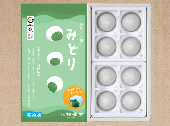 岩手大学の学内カンパニー彩景プロダクション(学生が運営する仮想企業)が企画協力を行い開発した抹茶だれの入ったごま摺り団子の姉妹品です。濃いめの抹茶味が特徴です。一関市厳美町本寺の平泉・中尊寺献上米「骨寺村荘園米」、一関地域を中心として搾られた不二家乳業の「いわて酪農牛乳」、三陸産の昆布を使用し作られた大船渡産の「根昆布藻塩」を使い岩手県産の食材にこだわりました。今回協力した農学部学生が地元一関の食材を使い農産業を盛り上げていきたいという思いから生まれた商品です。
