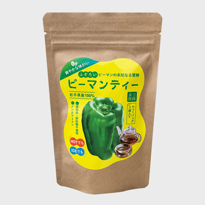 岩手県産の不揃いのピーマンのみを使用した保存料、添加物不使用のティーパックになっているお茶です。ホットでも水出しでもお楽しみいただける、さっぱりとした和紅茶のような甘味のあるお茶は、ピーマンの新たな価値を生み出すために誕生しました。製造にあたり、地元の高齢者の雇用促進、農家の努力を無駄にしないことで地域に貢献しています。