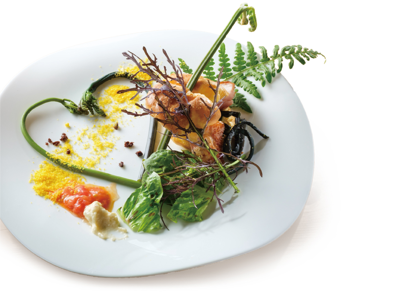 「西わらびの特長は、ねばりの強さ。熱の入れ方によってねばりの質も変わりますので、その違いをぜひ味わってほしい」と鈴木智之さん。グジェールはシュー皮を使ったフランス料理のひとつだが、主役となるのは西わらび。「一番ねばりが強いのが、生の状態なんです。この状態で味わえるのは、採れたてだからこそ」(鈴木さん)。生わらびの他、燻製とおひたしも一皿の中に。全てねばりと食感が異なり、西わらびの奥深さが楽しめる。