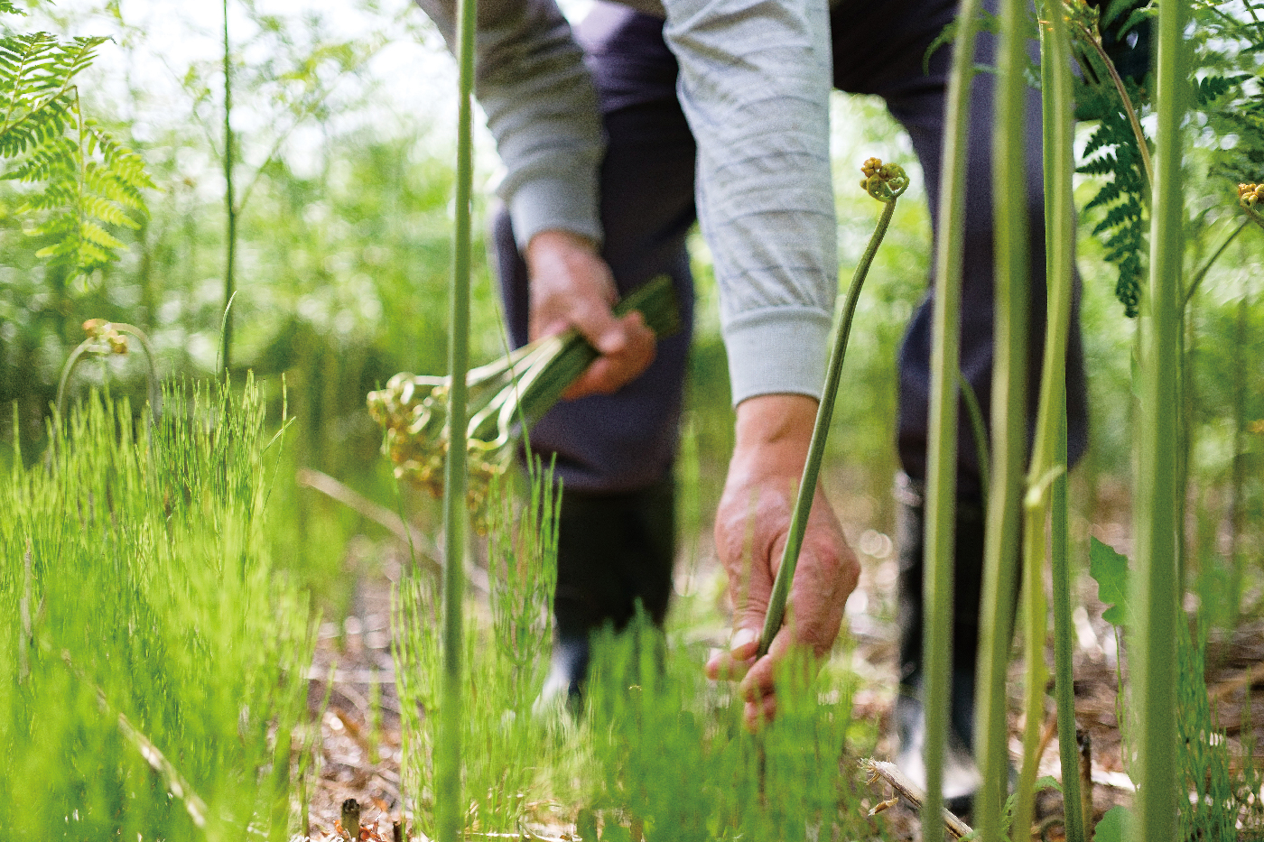 西わらびの栽培は、山でわらびの根を掘り、畑に植えてから成園化するまでに約2年を要する。最盛期は5月から6月と短い。生産者の一人、湯沢正さんは、最盛期には午前4時から収穫を開始。午前6時までの約2時間に集中して作業する。腰をかがめて覗き込みながら、食べ頃のサイズを摘み取り、次々に籠へと入れていく。