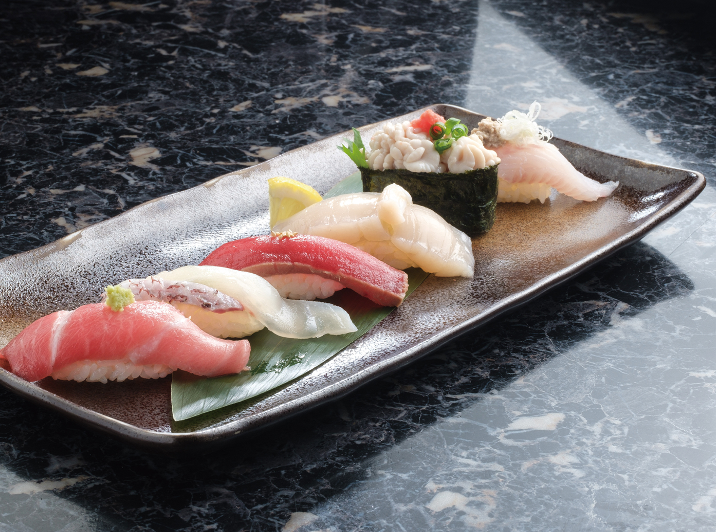 Chef’s Memo 左から、本鮪大とろ、天然真鯛、自家製づけ鮪、荒海活ほたて、三陸産たらの白子軍艦、釣りどんこ(肝味噌添え)。