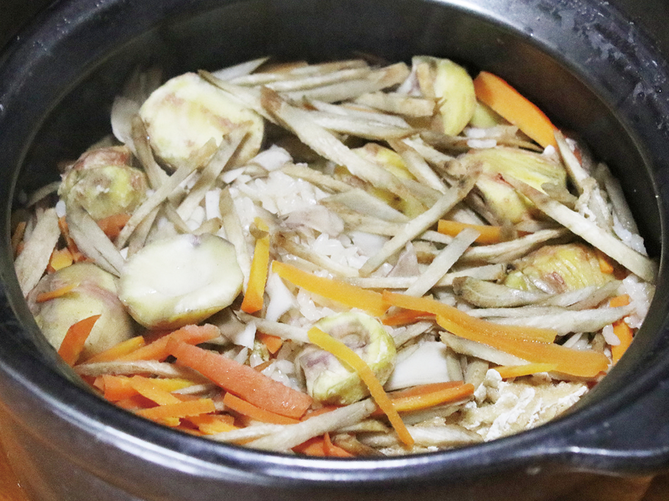 - 土鍋に米と具材、水550㏄、調味料を入れ、軽く混ぜる。
