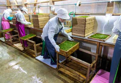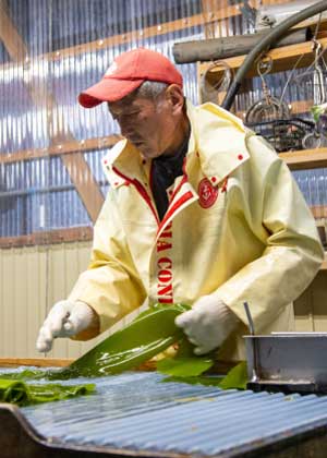作業場では、松葉さん家族のほか、熟練の職人が昆布の茹で上げから箱詰め(茹で→最適な部分のみを切り分け→細長く切断→木枠に入れて成型→乾燥→箱詰め)までの工程をほぼ手作業で行う。