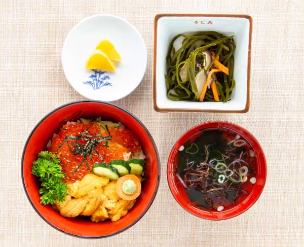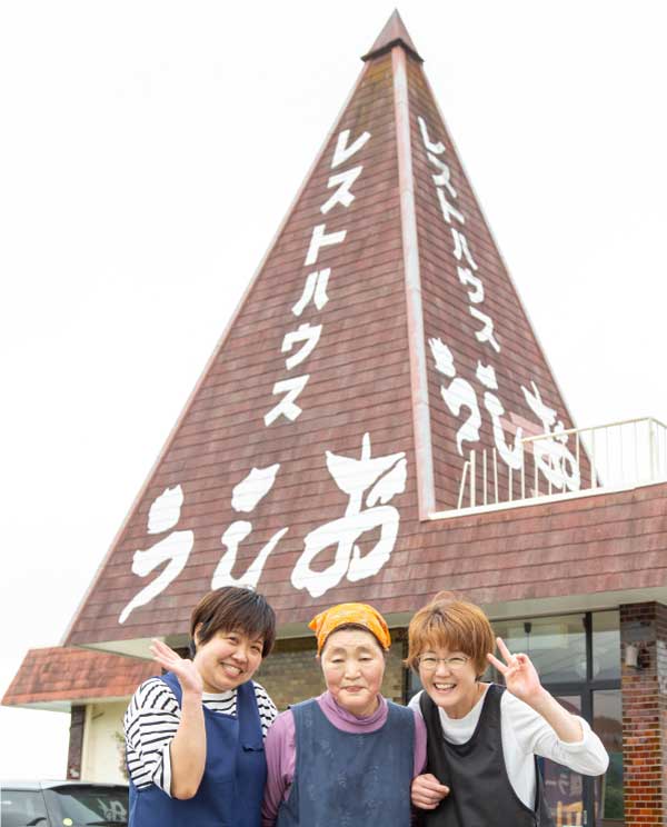 普代村の青い海と三陸鉄道を眼下に収めながら、新鮮な海の幸を楽しめる「レストハウスうしお」。名物のウニやイクラがぎっしり詰まった丼ぶりに、鮮やかな緑色のすき昆布の煮物が花を添える。「すき昆布職人」の別名を持つ太田さんが同僚の熊谷さん・金子さんと力を合わせて作る、海のおいしさを凝縮した逸品だ。甘さ・塩味の調和の取れた優しい味つけは、過去に漁師の妻としてすき昆布の生産に携わってきた経歴も持つ太田さんが、目分量で決める。また、食欲をそそる緑色は銅鍋によるもの。