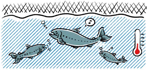 夜明けを迎えようとする6月下旬の久慈湾。空の底がゆっくりと白み始めたころ、まぶしいほどの照明を灯した漁船がエンジンをうならせて出港した。漁港から約10分。近付くとイケスの中には、銀色の魚体がちらちらと光って見えた。サーモンだ。前年の11月に岩手県遠野市の養魚場から稚魚の状態で収容された160gほどの稚魚が約2kgにまで育っている。出荷目安の1.5kgを優に超えて堂々と泳いでいた。船を横付けして、この日の予定している9tの水揚げが始まる。イケスに網を入れ、引き上げて、水槽に移す。この作業を何度も行った。帰港後は、サイズごとにタンクを分け、漁港に隣接する加工場へ運ぶ。加工場では、最初にウロコや頭、内臓、ヒレを除去。丁寧な手作業である。次に骨や膜、血液を洗い流す。品質保持につながる重要な作業のため、魚の大きさに合わせ、人の目と手でチェックしながら行う。下処理が済むと、注文に合わせて刺身用や半身、切り身などに加工。東北地区の量販店や首都圏の飲食店へ出荷する。