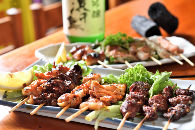 - 県産鶏肉の焼鳥、白金豚ロース炭火焼、刺身(魚種は時期による)