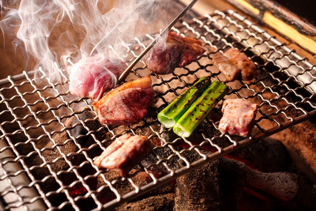 囲炉裏の炭火で焼き上げる「鶏焼肉」は、柔らかく風味豊かで、噛むほどに凝縮した旨味が溢れます。