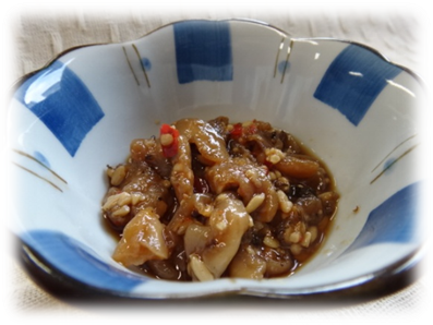 ①帆立の外套膜(ヒモ)と、伝統食の一升漬を混ぜ込んだものです。