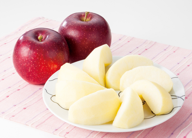 早生種収穫以降で中生種収穫前の9月下旬に成熟する品種として開発され、平成21年に品種登録されました。濃い紅色、強い甘み、淡い酸味、ジューシーながらパリッとした食感が特徴。見た目も食味も良いうえ、皮をむいた後に果肉が茶色に変色しにくいという特性もあります。